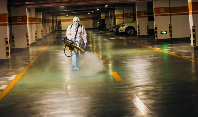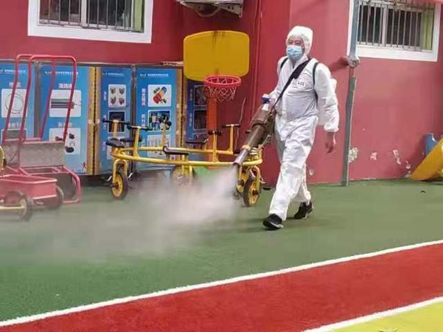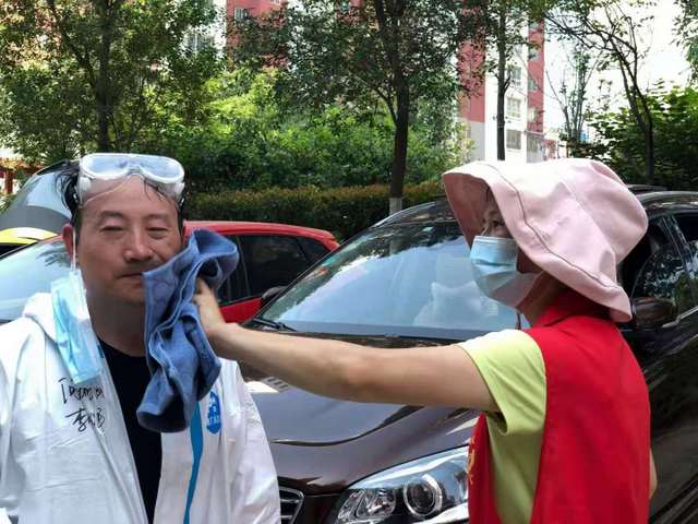 防护服、护目镜和口罩把人捂得严严实实,在37°的高温下,非常闷热,加之背着重达30多斤的消毒液和20斤的弥雾机,每次轮换时衣服全都湿透了。为保证安全,他们两人一组,一人消杀,一人跟随观察。每个队员都眼睛红肿发痒,由于任务重情况急,经过简单处理后继续工作。