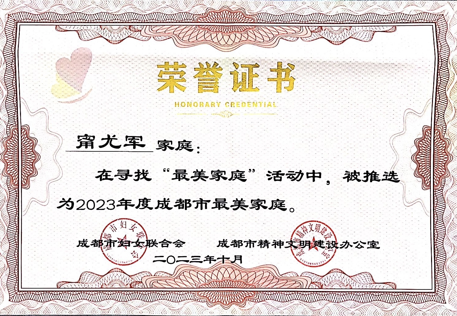 2023年度成都市寻找“最美家庭”评选活动自5月启动,经过层层发动、基层推荐、多方评审,最终有“清正廉洁”“绿色洁美”“孝爱和乐”“亲善教子”“勤俭自强”“扶贫助困”“爱岗敬业”“重义守信”“书香文明”“移风易俗”等10类100户“最美家庭”获得表扬。此次活动旨在通过最美家庭的动人事迹感染身边人,传播中华民族家庭美德和现代家庭文明新风,感召更多的家庭与新时代同频共振。