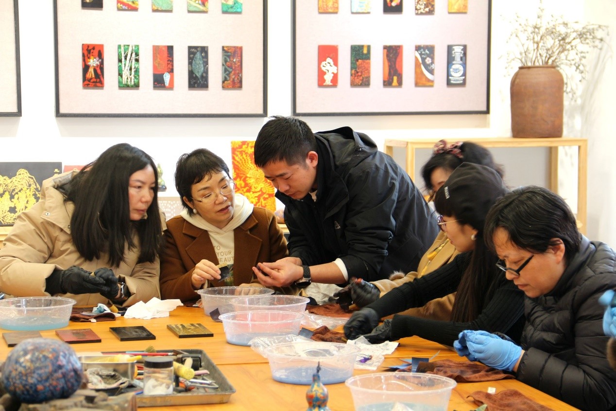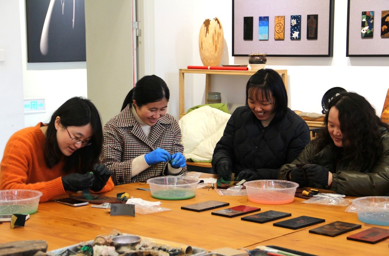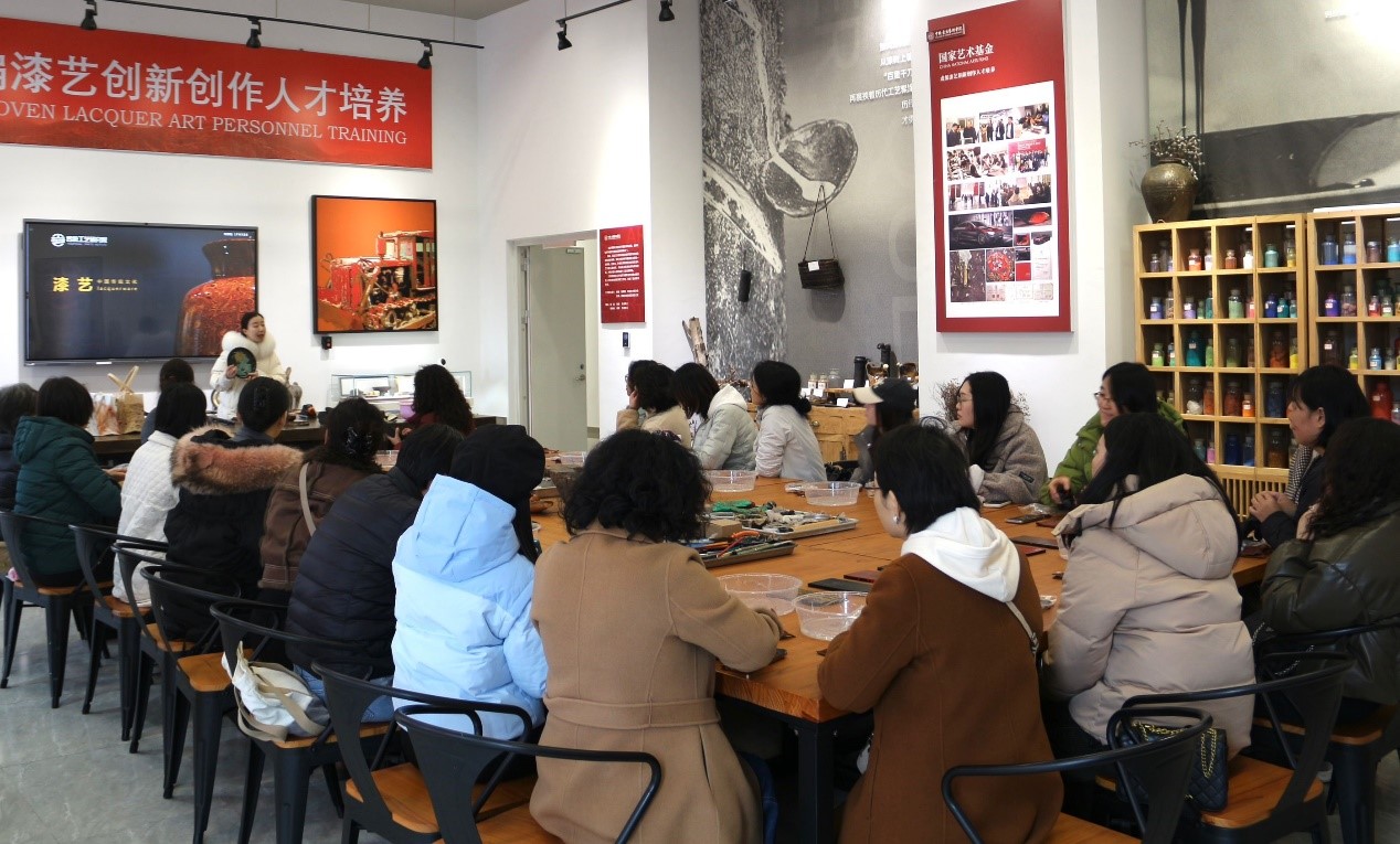 接着,女职工们走进艺术之旅的第二站:参观中国-东盟艺术学院传统工艺研究院,这里汇聚了三个研究所、十三个非遗工坊,宛如一座“活态博物馆”,在老师的讲解中了解蜀锦蜀绣、成都漆艺、四川竹编、印染、陶瓷、皮影、年画等非遗艺术的设计之美、创新之美、日用之美。
