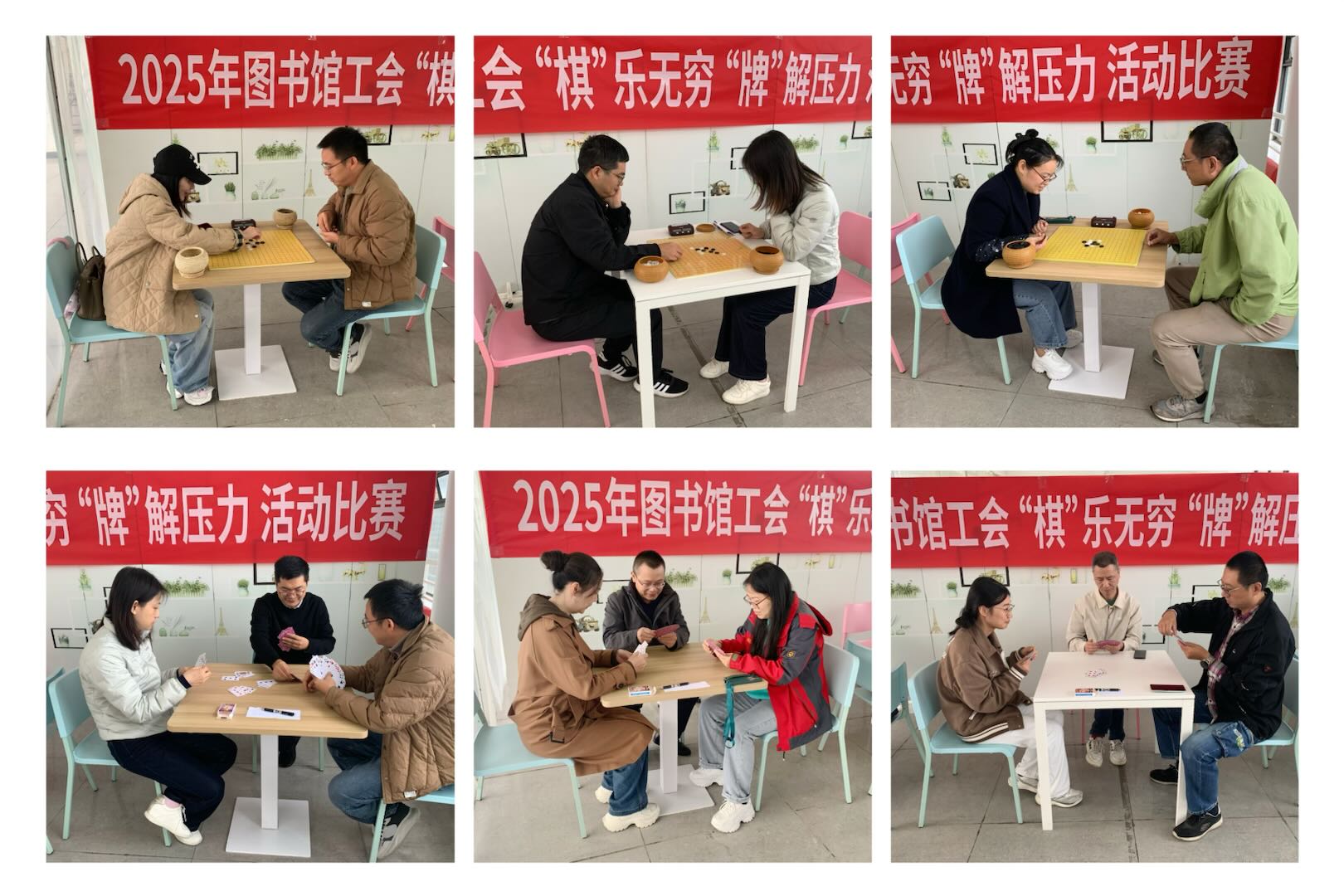 图书馆工会委员积极筹备比赛,两项比赛均以个人身份报名参赛,根据报名人数抽签分组,采用淘汰赛制。活动吸引10余名职工参加。比赛中,参赛队员全身心投入战局,方寸之间拼杀博弈,不论是选手还是观众,都被高超的牌局、棋局对阵,多变的应对组合所吸引,现场气氛紧张而愉快。
