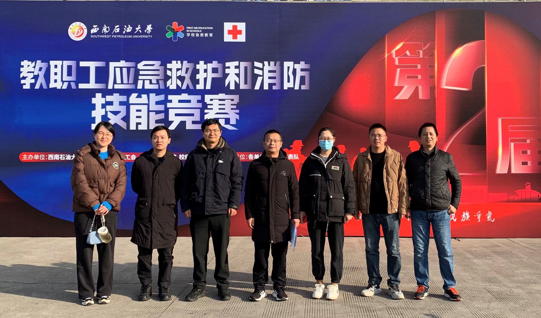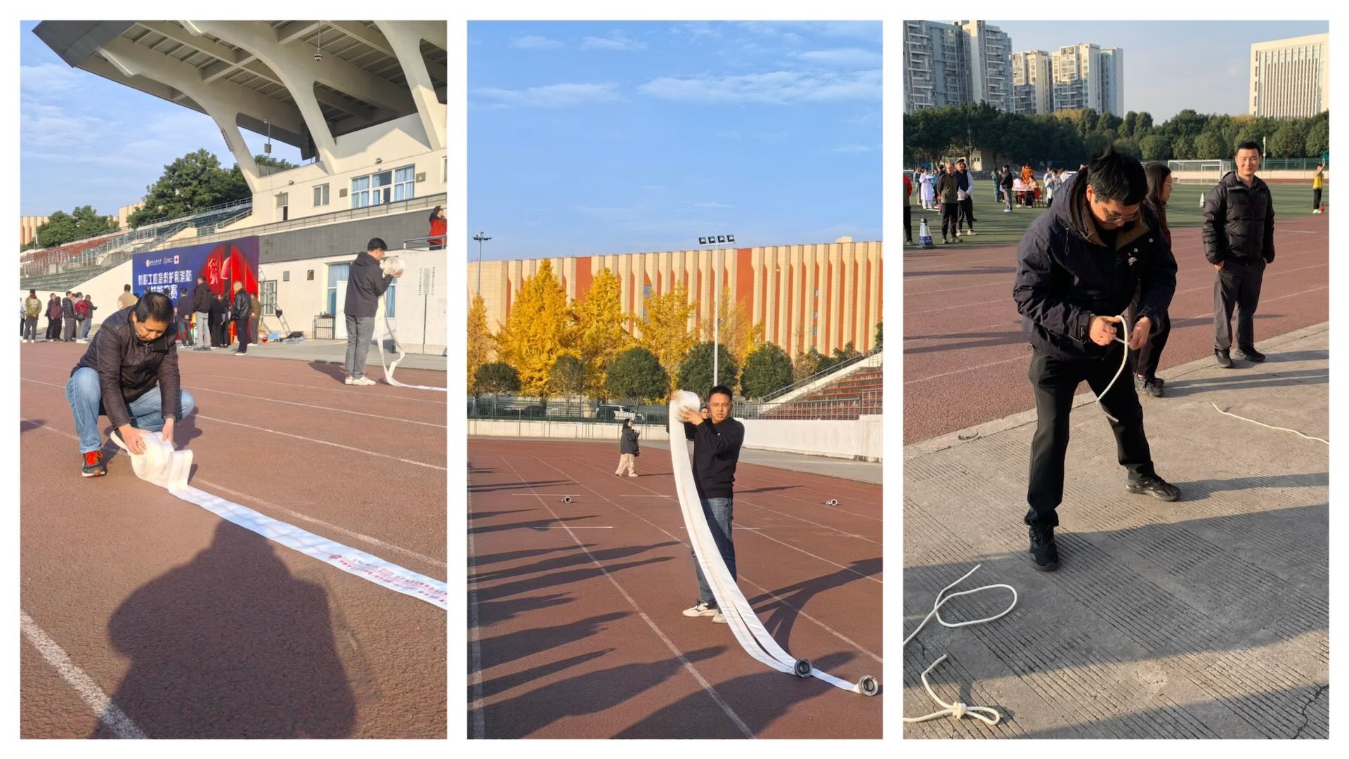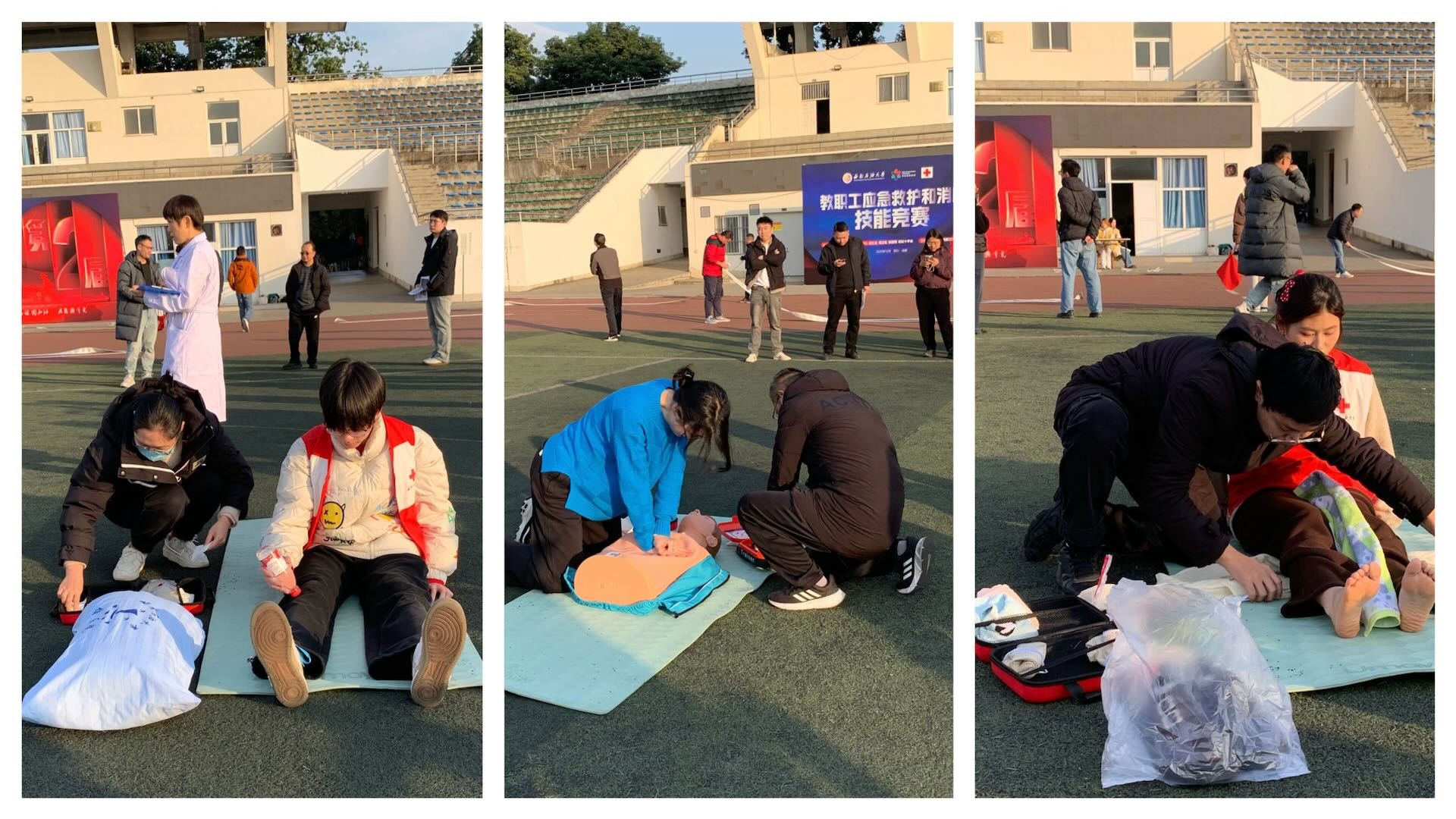 全校22支队伍同场竞技,队员们沉着冷静,配合默契。在消防技能环节,队员们稳定发挥,快速完成绳结制作,水带连接与油盆灭火操作一气呵成。在应急救护环节,队员们全心投入,规范、流畅地完成了检伤分类、双人心肺复苏与AED配合使用以及创伤包扎等系列操作。面对队员临时无法参赛的突发状况,任杰麟老师临时挺身而出,熟悉竞赛内容,争分夺秒强化练习,确保团队的完整战斗力。比赛中,参赛队员汪若兰老师感冒高烧,仍然坚持带病上场,最终团队以出色的表现圆满完成了所有比赛项目。