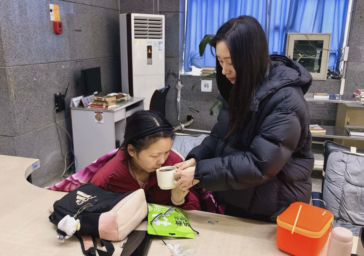 女同学小口啜饮着红糖姜水,加上毛毯和“暖宝宝”的作用,几分钟后,紧绷的眉头慢慢舒展,苍白的脸颊终于红润起来。看到这一幕,曹老师、林老师和女留学生都不约而同地松了一口气,脸上露出了欣慰的笑容。